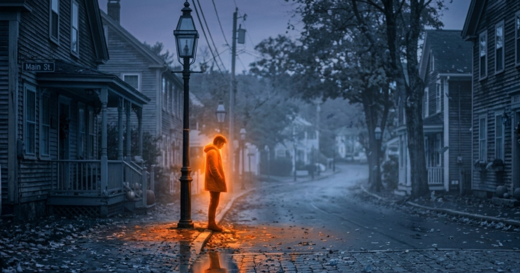 On a quiet street at dusk,